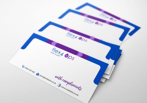 Print your custom compliment slip designs with Flex4. Add a new level of professionalism to your business with highly quality compliment slips - minimum print quantity of 500.